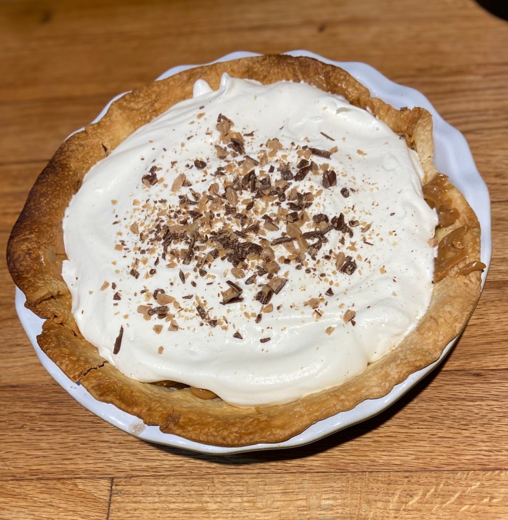 - Slice the bananas thin. Layer the bananas and the caramel in the pie shell.