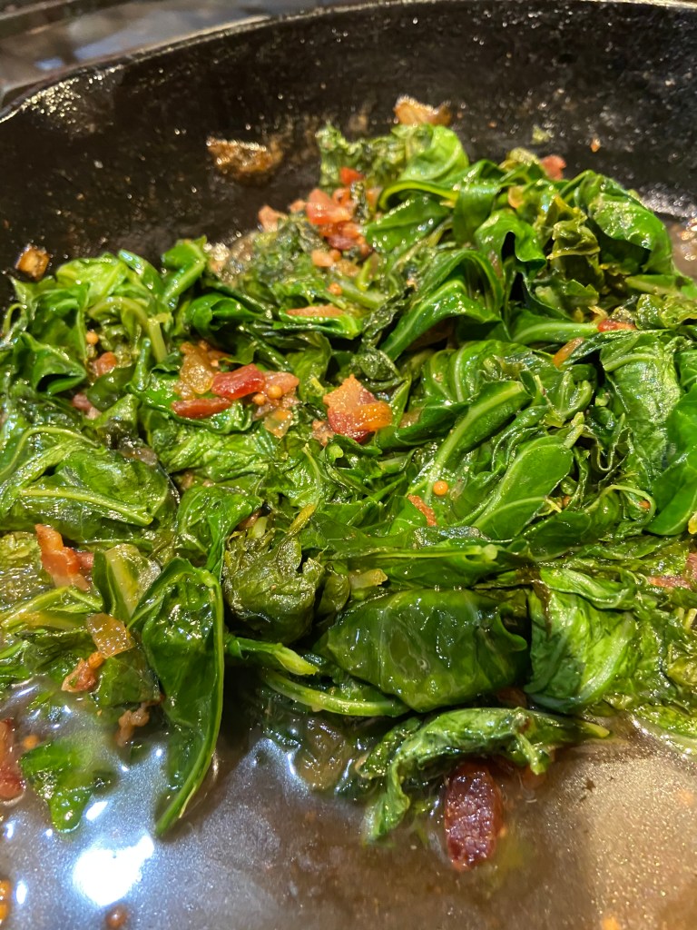 I did not grow up eating greens. Maybe my mom thought they were too “country” (also in this category of things my mother never cooked — cabbage, pork chops, and anything fried. She would happily enjoy fried catfish or fried chicken… elsewhere.) Or maybe we were just picky kids (I do, distinctly, remember steamed broccoli with cheese-Whiz being a favorite vegetable side. Adult-me cringes).